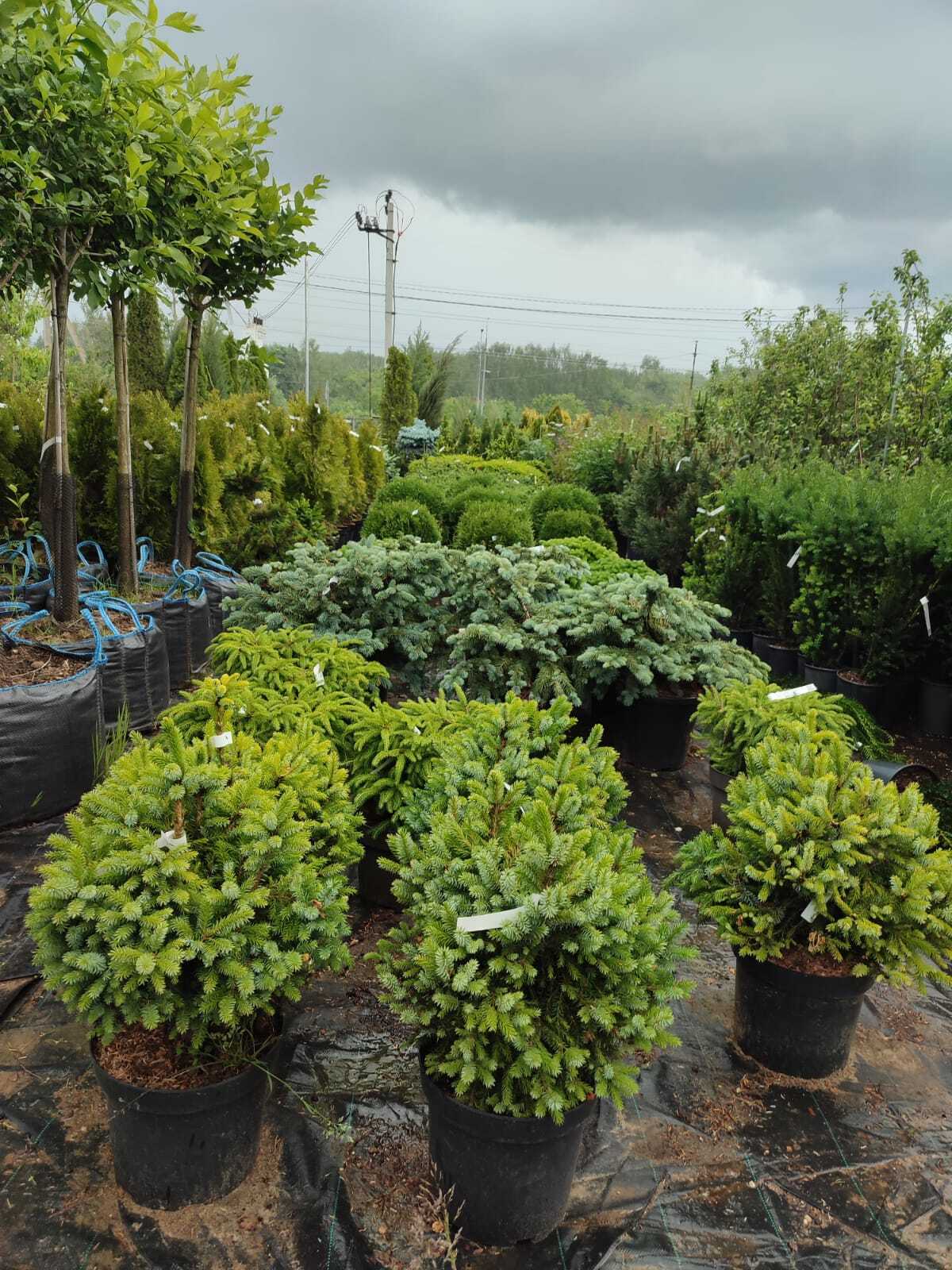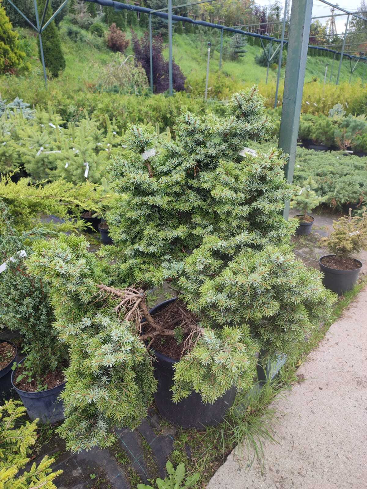 Карликовая форма высотой до 3,5 м, растет медленно. Крона ширококоническая, очень густая и неравномерная, до 2,5м. Стебли короткие жесткие. Хвоя плотная, расположена на побеге радиально, сверху желто-зеленая, снизу голубая, 5-10 мм длиной. Хвоя с верхней стороны темно-зеленая, блестящая, с нижней бело-голубая. Плоды - шишки, вытянутые, коричневые, от 3 до 6 см.