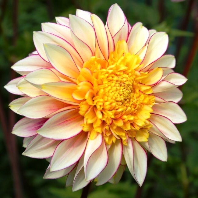 Георгина анемоновидная Полька имеет высоту растения 70-90 см. Цветок кремово-желтый с тонкой малиновой каймой и штрихом, диаметр цветка около 13 см.