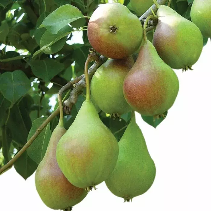 Плоды массой 80 г, грушевидной формы, гладкие. Плодоножка длинная и изогнутая. Воронка отсутствует. Оржавленности нет. Блюдце у нее мелкое, слегка бороздчатое. Окраска зеленоватая, на меньшей части плодов с буровато-красным румянцем. Мякоть сочная, кремовая, нежная. Вкус пресно-сладкий, с особым ароматом. Срок хранения от 2 до 2,5 месяцев. Скороплодный.