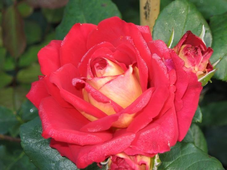 Бутоны длинные, острые. Цветки красно-желтые, на обратной стороне лепестков - золотисто-желтые, крупные (10—11 см), махровые (30—40 лепестков), с легким ароматом.