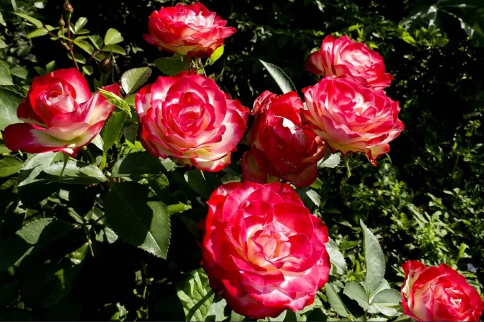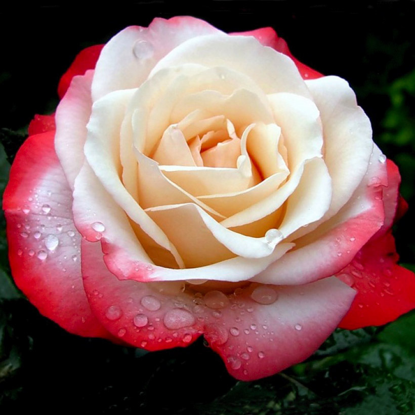 Цветки крупные, махровые, чашевидные, с закрученными белыми лепестками в центре и красной каймой. Цветки раскрываются медленно, долго стоят в срезке, и хорошо держат цвет. Лепестки имеют слегка волнистый край, так что цветок сохраняет привлекательность на всех стадиях роспуска.