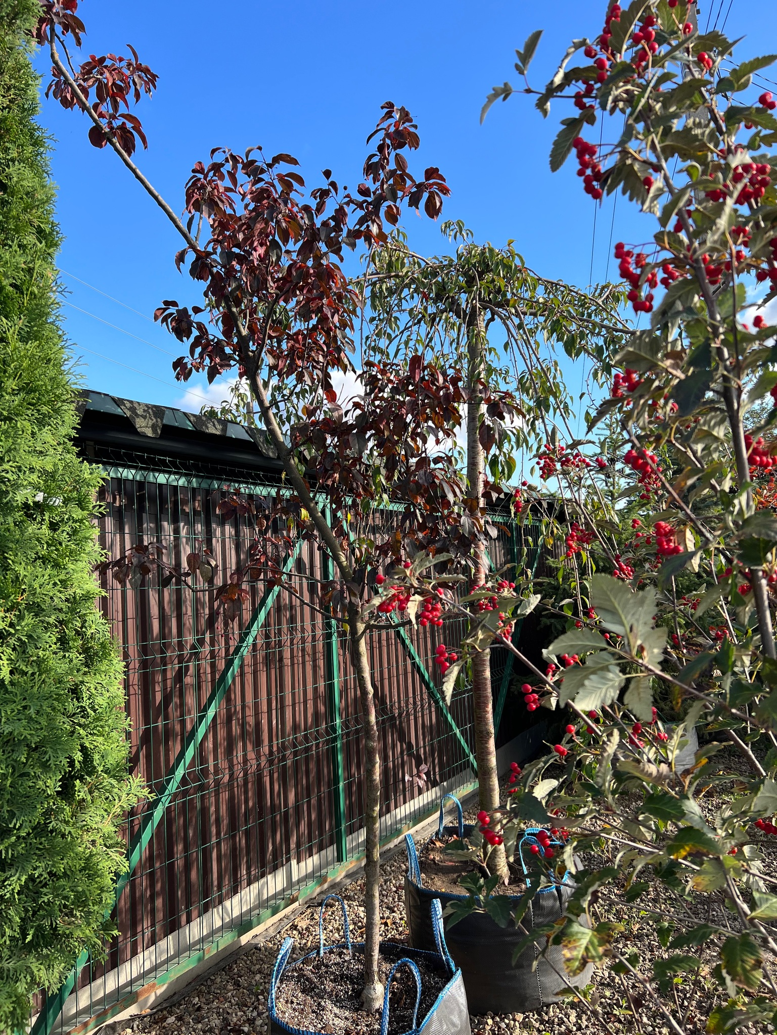 В начале осени из цветков образуются плоды мелкого размера (чуть меньше ягод вишни), слегка продолговатой формы, темно-красного окраса с сизым восковым налетом. Созревают они обычно в середине сентября и удерживаются на длинных плодоножках. Несъедобны.